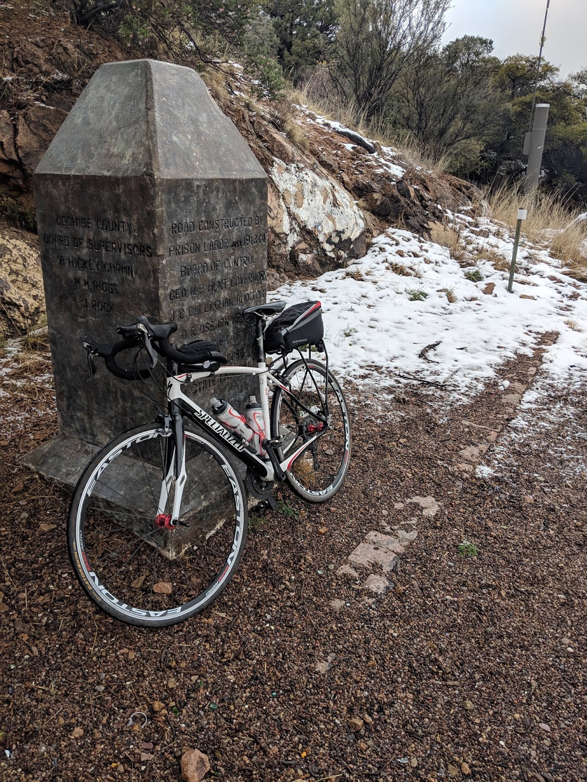 Never rode while it was snowing. Quite the experience. Reached the Divide and took a shot of my bike hanging off the Divide marker.